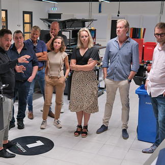Onder begeleiding van verschillende medewerkers werden in kleine groepjes de verschillende bedrijfsonderdelen bezocht. Van directieruimte en de creatieve studio tot de productieruimten en het magazijn. We zagen UV-printers voor direct print op kleine artikelen, geschenken, give-aways en groot formaat prints op allerlei materialen. En een printer voor zelfklevende bedrukkingen met inkt direct op de lijmlaag. Daarmee kun je op alle materialen en vormen je bedrukking aanbrengen. Maar ook borduurmachines en DTF printers voor het bedrukken en voorzien van transfers op textiel en bedrijfskleding. Er is nu zelfs een hoogwaardige personalisatietechniek om je merk in een product te vereeuwigen, een top keuze voor luxe geschenken van metaal, hout, leer en glas. En een CO2 laser voor grote platen van bijvoorbeeld bamboe en acrylaat voor bijvoorbeeld plexiglas letters. Deze lasers werken sneller en goedkoper dan frasen en zijn veel mooier in de afwerking. Oprecht indrukwekkend!
